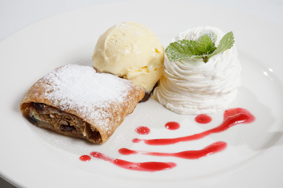 Штрудель с изюмом и грецким орехом. Подается с шариком ванильного бельгийского мороженого и взбитыми сливками.